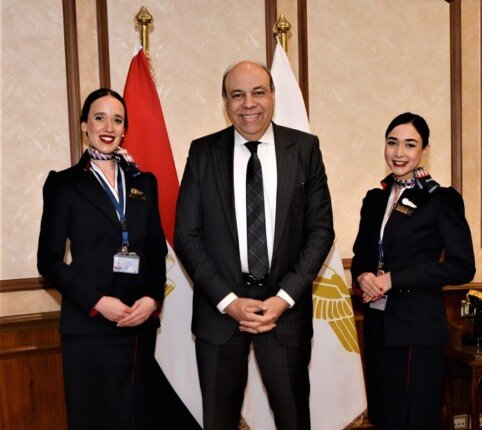 تكريم وزير الطيران المدني لمضيفتي مصر للطيران تقديرًا لجهودهما الإنسانية والمهنية